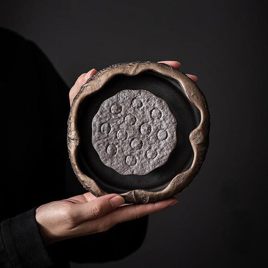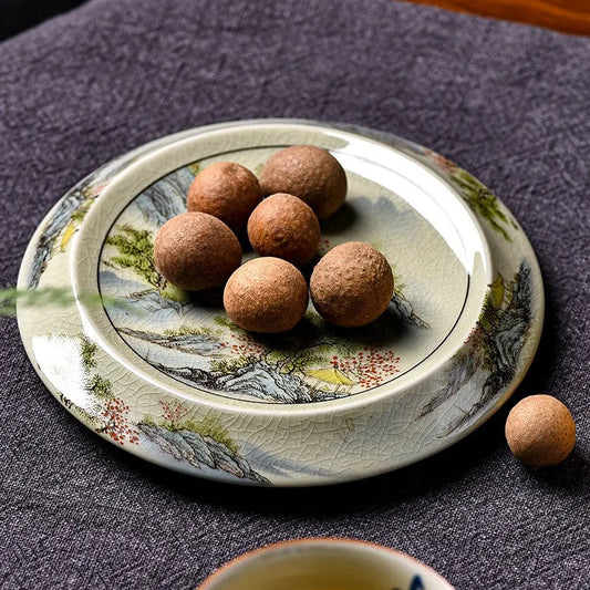壶承与茶盘,是中国茶席上静默的「基石」,其形制可追溯至唐宋茶事。唐代煎茶以「茶台」聚拢器皿,宋代点茶尚「建盏托承」,明清紫砂壶盛行后,壶承渐成独立茶器,以低调之姿托起壶中乾坤。匠人依古法造器,取瓷、陶、竹木或端石为材,形制或圆如满月、或方似砚台,边缘浅凹蓄水,既承茶汤润养之趣,亦暗合「天圆地方」的宇宙观。