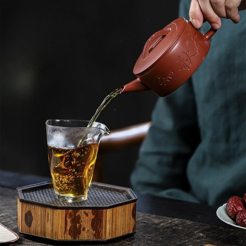 【工艺】全手工制作 - 全手工紫砂壶完全不借助模具,由匠人纯用手工拍打泥片、镶接成型。每把壶都是独一无二的艺术品,耗时极长,技艺要求极高。其好处在于:壶体泥门紧实,双气孔结构更优化,长期使用能极大提升茶汤口感和香气层次。它不仅是一件茶器,更是具有收藏价值的艺术品,体现了制壶匠人的至高技艺。